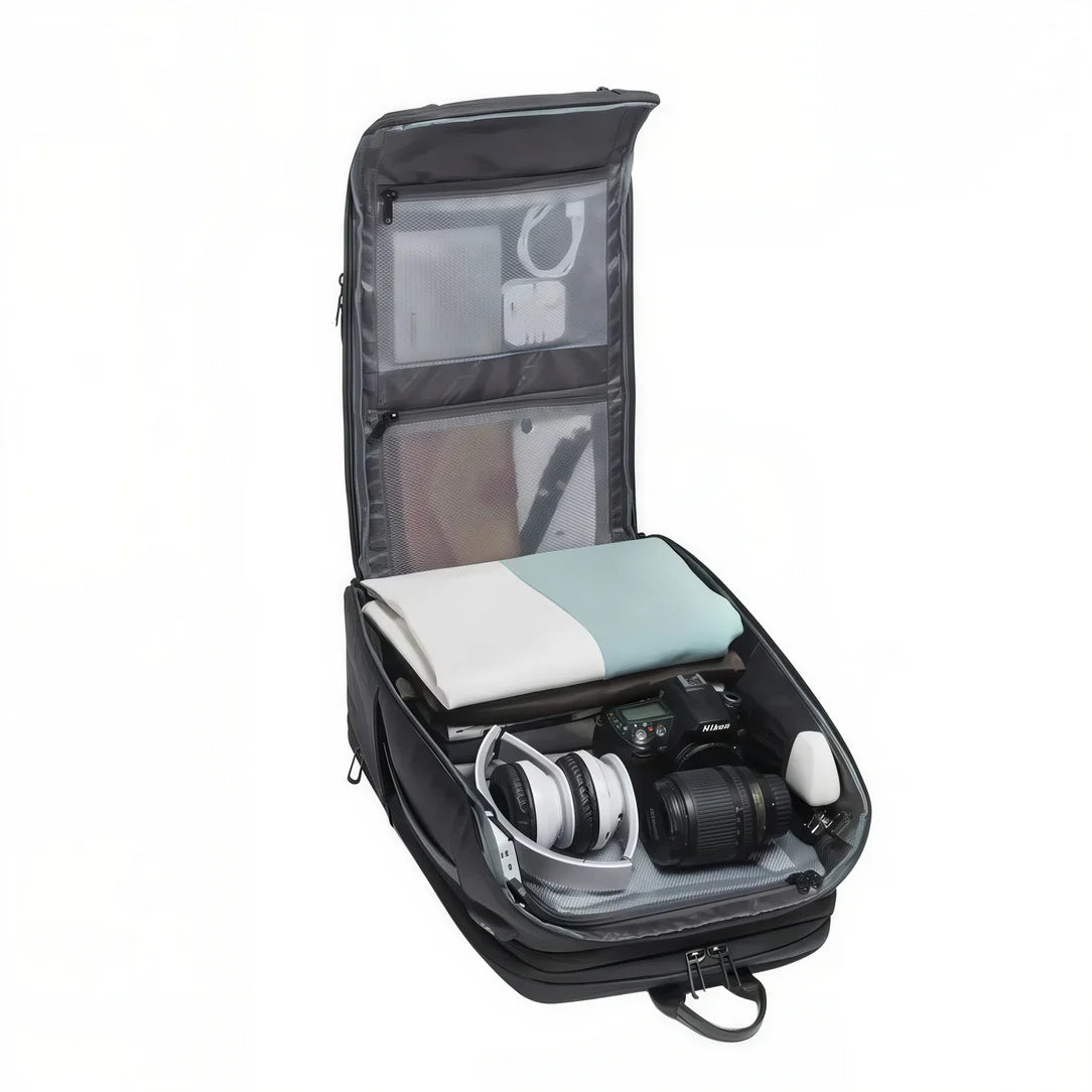 The main compartment opens 180° for quick and easy organization . Thanks to the zippered divider and internal pockets, everything will stay securely in place during your trip.