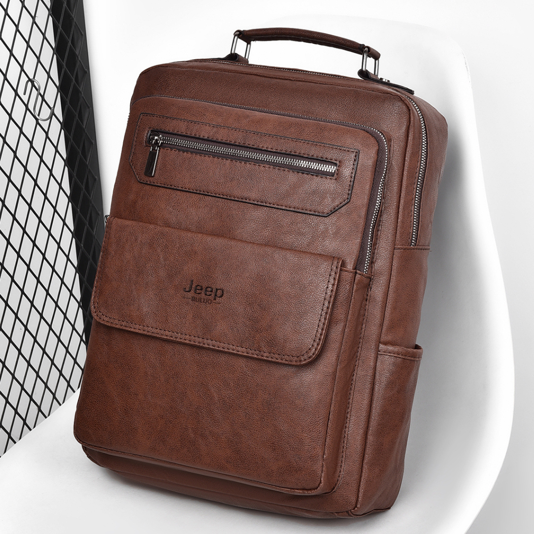 Le JeepPack I se distingue par sa silhouette rectangulaire très droite, qui lui donne un aspect cartable chic tout en restant fonctionnel. Il est doté de deux compartiments, dont un principal avec un emplacement intégré pour ordinateur 15 pouces, parfait pour le quotidien professionnel.