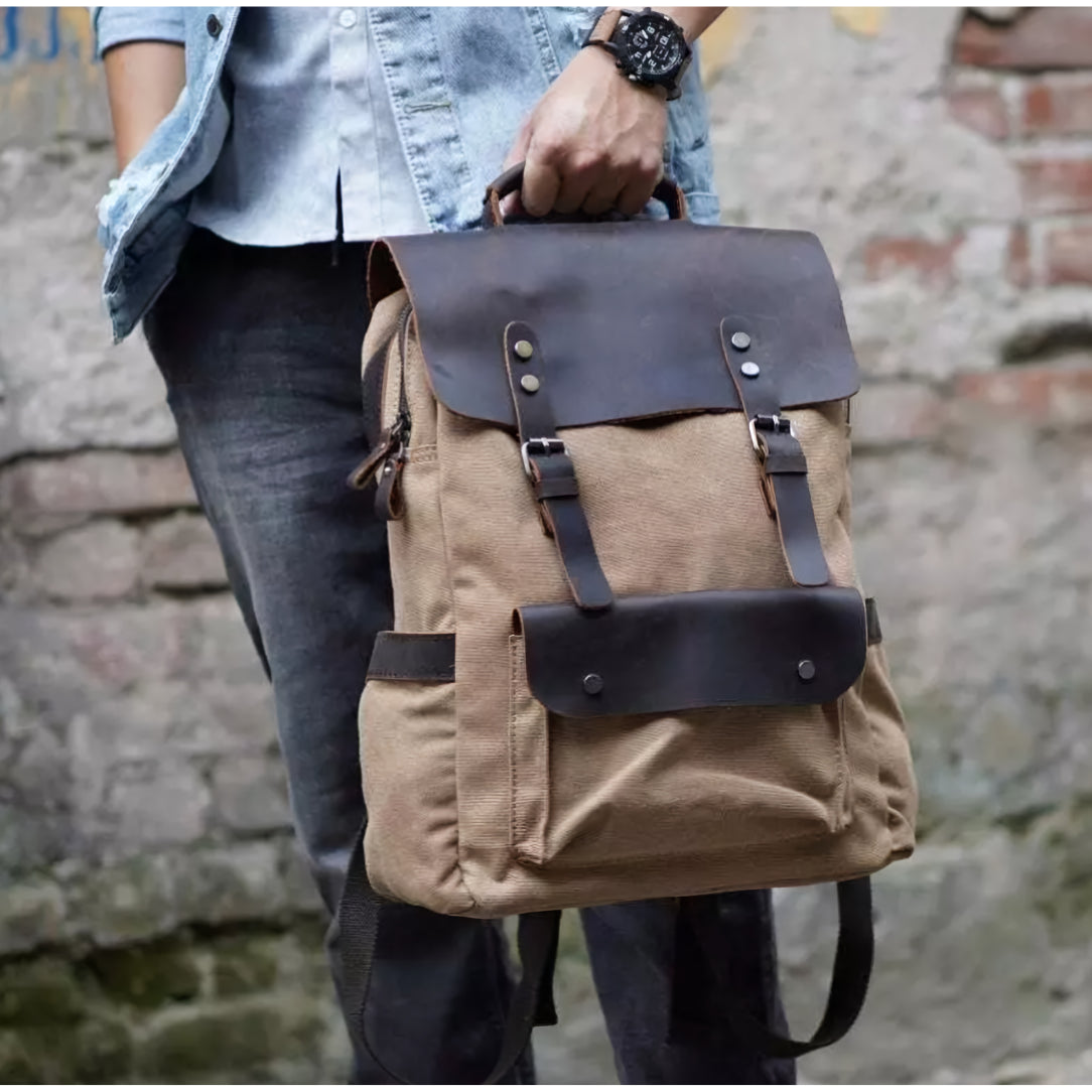 La toile assure une légèreté agréable au porter, tandis que le cuir, utilisé pour les poches, la poignée et les sangles, apporte du caractère et se bonifiera avec le temps.